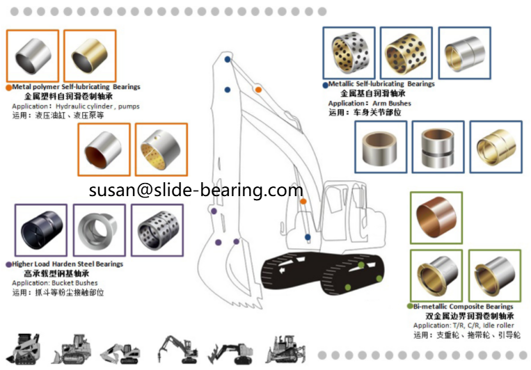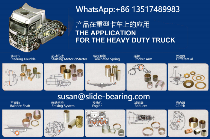 JF-MP friction welded shaft sleeve is used for supporting heavy wheels, supporting chain wheels, and guide wheels; Bimetallic and SF series bushings are used in the arm frame, connecting rod, legs and other parts of pump trucks; The JDB series solid embedded lubrication series shaft sleeve is used in parts such as the boom, arm, amplitude modulation mechanism, and oil cylinder.